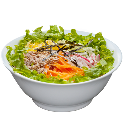 Alface, Arroz temperado, Cenoura, Cream cheese, Kani, Omelete em tiras, Pepino, Salmão Grelhado, Sushi aberto na tigela composto por